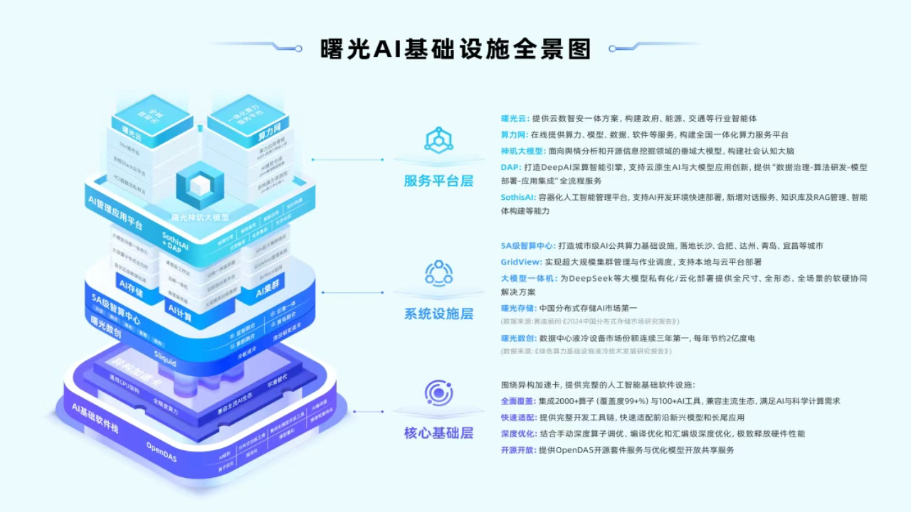 在长期产业实践中,中科曙光超前布局、反复打磨出全栈智能化产品矩阵—“曙光AI基础设施”,以“从芯到云,软硬协同”的核心理念,直指算力墙、存力墙、通信墙、调优墙、能耗墙等五大瓶颈。