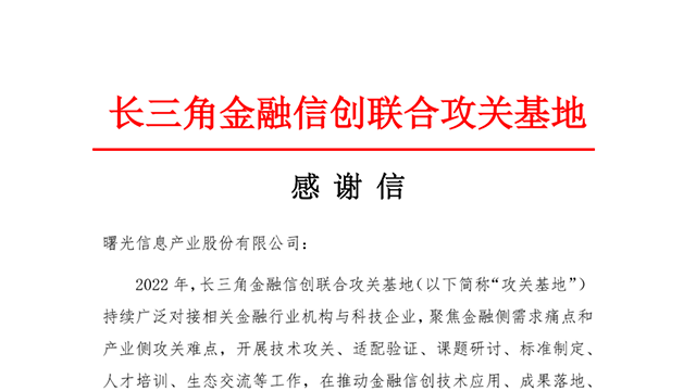 喜讯!曙光获长三角金融信创联合攻关基地感谢信