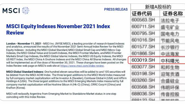11月30日,中科曙光被纳入MSCI中国A股指数。MSCI中国指数(MSCI China Index)是由摩根斯坦利国际资本公司(MSCI)编制的跟踪中国概念股票表现的指数。被纳入指数因素包括公司规模、行业代表性等。