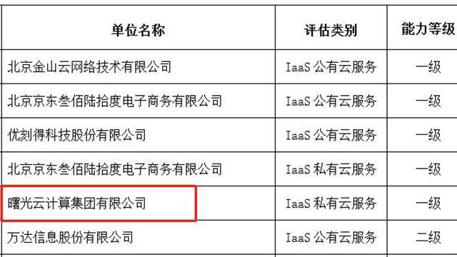 中国电子工业标准化技术协会信息技术服务分会(以下简称ITSS)对外公布了最新一批被授予云计算服务能力符合性证书的企业名单,曙光云因其云服务能力在规模、功能、性能、安全、人员和管理等维度全面满足工业和信息化部《云计算综合标准化体系建设指南》的最高要求,荣获云计算IaaS服务能力符合性评估一级认证。