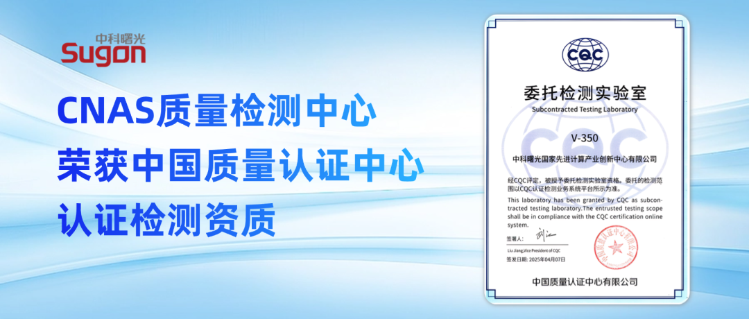 近日,中科曙光CNAS质量检测中心正式签约成为中国质量认证中心(CQC)“自愿性产品认证委托检测实验室”,可正式对外开展计算机产品的节能认证检测,出具CQC认证检测试验报告。