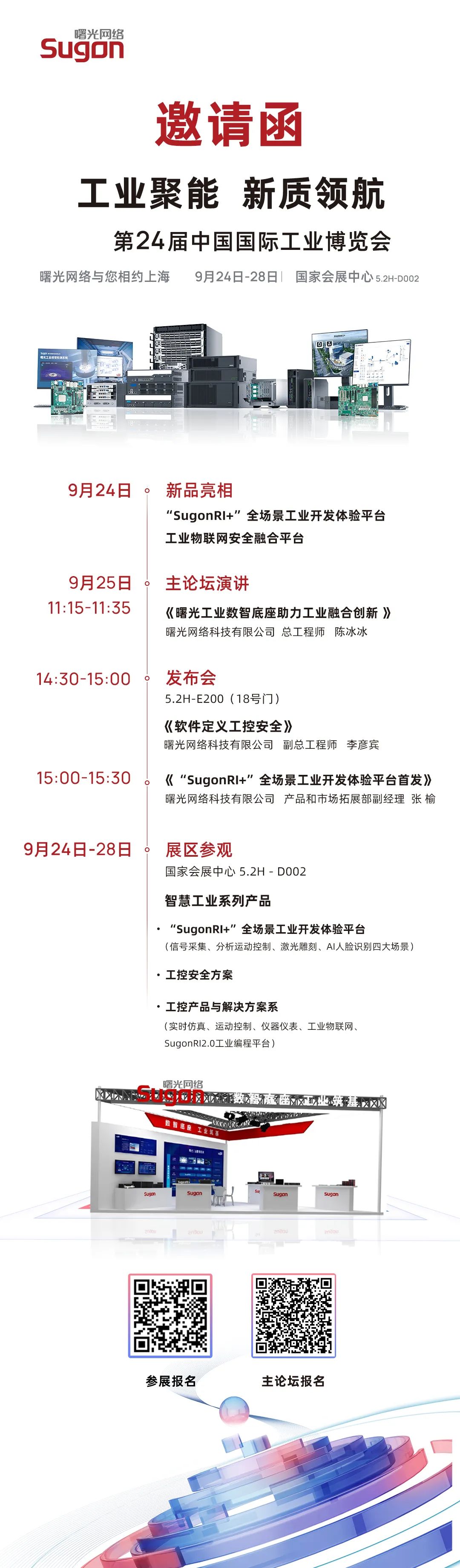 9月24日,中国国际工业博览会即将正式召开。曙光网络将携最新国产工业数智底座技术产品与多重解决方案亮相展会,同时还将首发全场景工业开发体验平台“SugonRI+”与工业物联网安全融合平台,重磅惊喜,敬请期待!