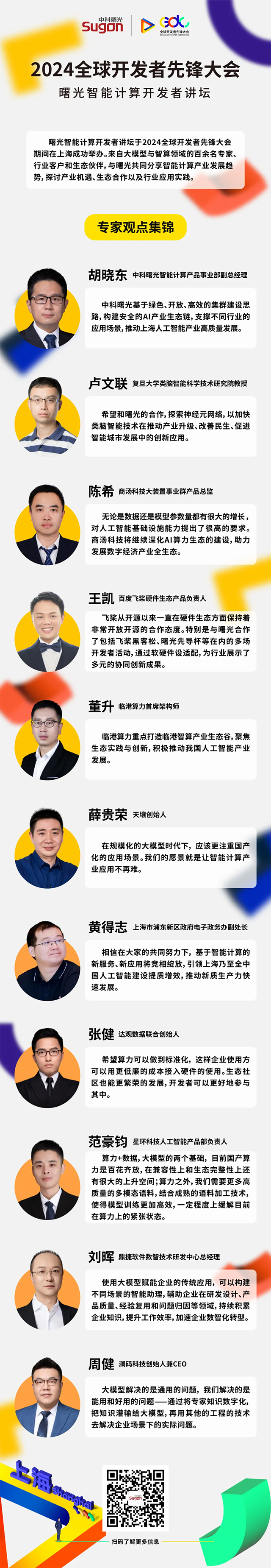 曙光智能计算开发者讲坛于2024全球开发者先锋大会期间在上海成功举办。来自大模型与智算领域的百余名专家行业客户和生态伙伴,与曙光共同分享智能计算产业发展趋势,探讨产业机遇、生态合作以及行业应用实践。