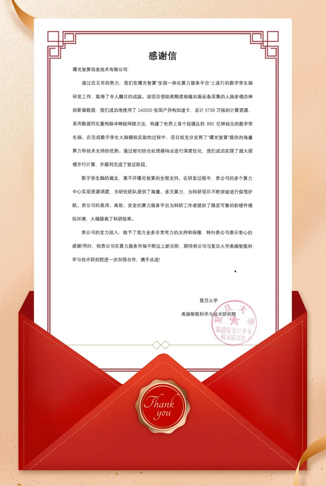 近日,曙光智算收到由复旦大学类脑智能科学与技术研究院发来的感谢信,研究院对曙光智算一直以来的有力支持和保障,表示衷心的感谢,并期待进一步加强合作,携手共进!